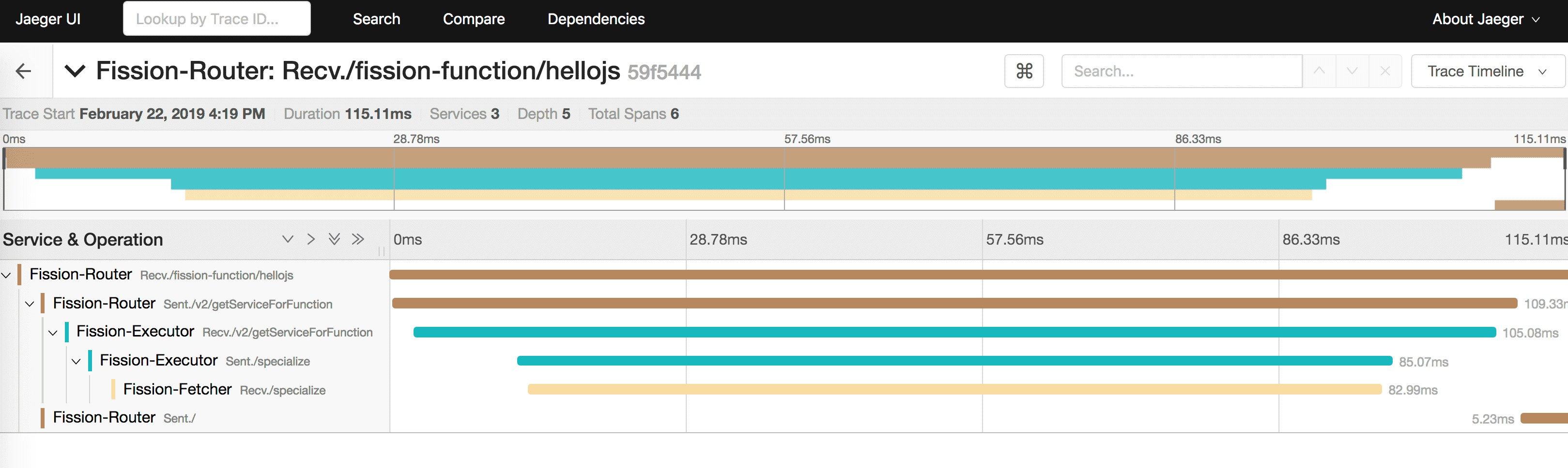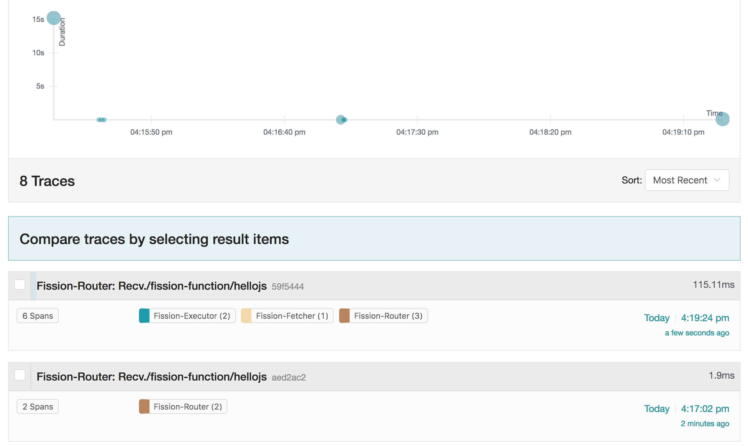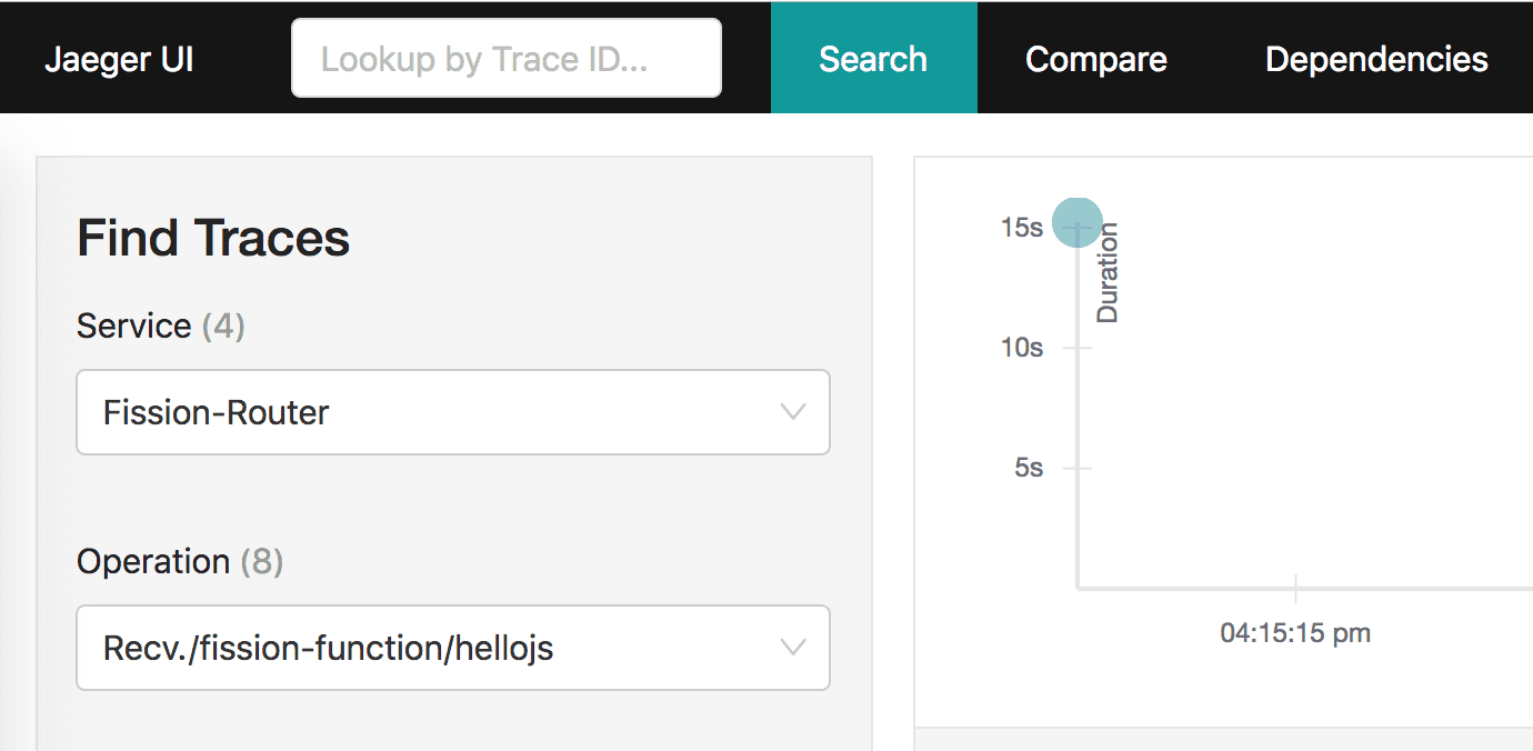 Let’s choose the Fission router service and hellojs operation which corresponds to our recent invocation and search for traces.